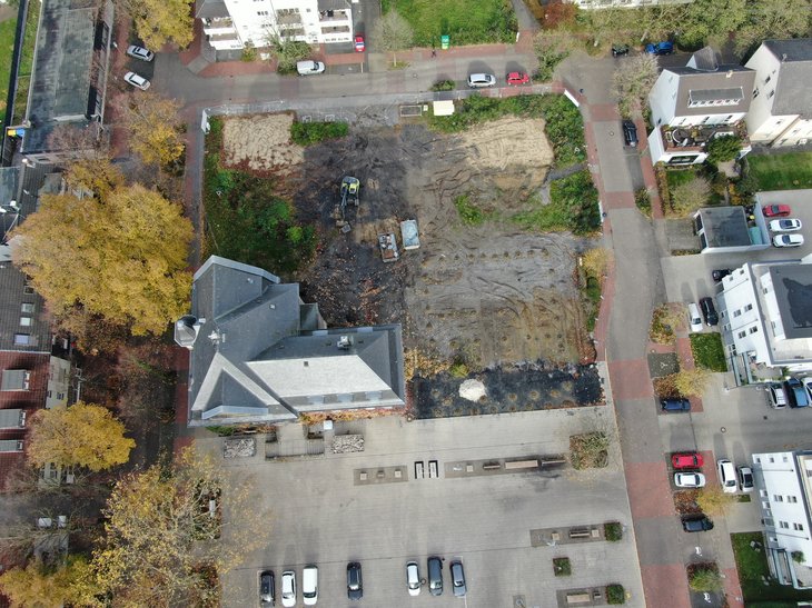 Die Planungen des Architekturbüros, Anträge auf Städtebauförderung prägten das weitere Procedere, die Gebäude Poststraße 2 und 4 wurden abgerissen und im Oktober 2018 erfolgte der endgültige Baubeschluss. Dazu noch ein Drohnen-Luftbild von Detlef Drossel zur Ausgangslage des Gesamtgeländes mit den Verwaltungsgebäuden Poststraße 2 und 4, Parkplätzen und der Wasserversorgung in der alten Feuerwache mit dem Materiallager.