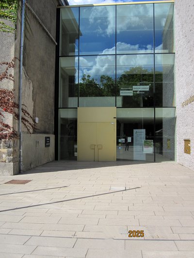 Eine Auflistung sämtlicher Gewerke über Fenster, Elektrik, Energieversorgung u. Technik, Malerarbeiten, Böden usw. kann hier nicht erfolgen und wir blicken auf die erreichte Endsituation Ende 2022 und betreten das Rathaus durch den neuen Eingangsbereich. Linksseitig die denkmalgeschützte Außenfassade der Ostwand altes Rathaus. Das alte Rathaus wurde übrigens im Rahmen des neuen Anbaus behindertengerecht kernsaniert nun mit Aufzug aus dem Foyer erreichbar, rechts die Klinkerwand des neuen Anbaus und Eingangstür mit Glasfassade zum Foyer.