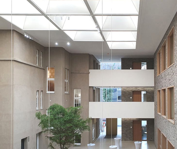 und eingefügt der alte Rathausbau im Foyer mit den verknüpfenden Fluren zum Anbau