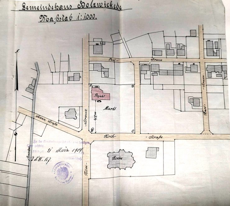 Als Baugrundstück hatte der Gemeinderat das Gelände nördlich der evangelischen Kirche festgelegt mit genügendem Platzangebot für den vorgesehenen Marktplatz zwischen Kirche und Gemeindehaus. Dazu der Lageplan vom 21.März 1914. Das Gemeindehaus -Projekt rot gekennzeichnet. Quelle Archiv Gemeinde Holzwickede