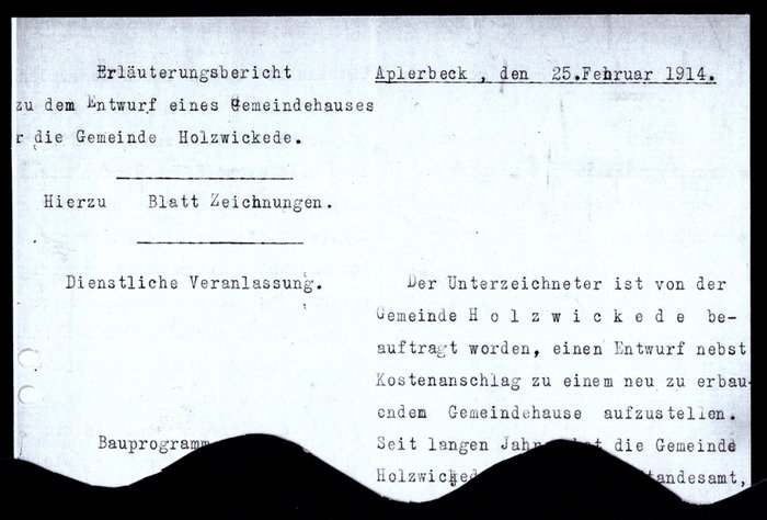 Ferner reichte Amtsbaumeister Stricker zu dem Entwurf des Gemeindehauses einen 5seitigen interessanten Erläuterungsbericht ein mit Datum vom 25. Februar 1914 an die Gemeindeverwaltung Holzwickede u.a. mit Ausführungen zum Bauprogramm, zur Beschaffenheit der Baustelle und des Baugrundes, zum Bauentwurf und zur Bauart (Quelle Gemeindearchiv Holzwickede).