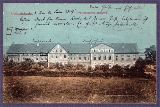 Der Zögling der Präparandenanstalt Hugo Möllenbrok schreibt vorstehend am 3. November 1906 seinen Eltern eine Karte nach Remminghausen bei Detmold und hat vorderseitig die Präparande durch Strichzeichnung vom Waisenhaus getrennt versehen und mit tollen persönlichen Hinweisen. Er hat seinen Schlafsaal und die Stube markiert und deutlich erkennbar der stark vergrößerte Komplex des Erziehungshauses.