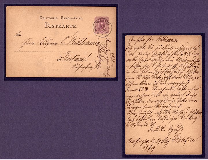 Mit erstaunlicher schöner Schrift kann Friedrich Stehfen mit einer Postkarte vom 19. Mai des Jahres 1879 noch dokumentiert werden. Er schreibt persönlich an den Kaufmann Büddemann in Dortmund mit „Freundlichem Gruß Rausingen den 19.Mai 1879 Stehfen“. Mit dem Namen Büddemann verbindet sich nun eine Beziehung, die ich nicht richtig recherchieren konnte. Denn die Tochter Margarete von Friedrich Stehfen war verheiratet mit Ludwig Büddemann und den Eheleuten hatte Friedrich Stehfen schon vor seinem Tod den Hof vererbt. Seine beiden Söhne studierten, der älteste Sohn (auch Friedrich) Theologie wurde Pfarrer in Waldau (bei Kassel) und hielt dem Vater am Grab die Todesrede.