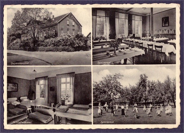 Dazu noch einmal eine spätere Gesamtansicht des Erziehungshauses mit Speisesaal, Schlafzimmer (in diesem Fall mit 7 Betten eng gestellt) und ein Blick auf die Spielwiese mit dem beliebten Bewegungsspiel „Bäumchen wechsel dich“ wobei die Bäume wohl durch Personal und weitere Kinder besetzt wurden.