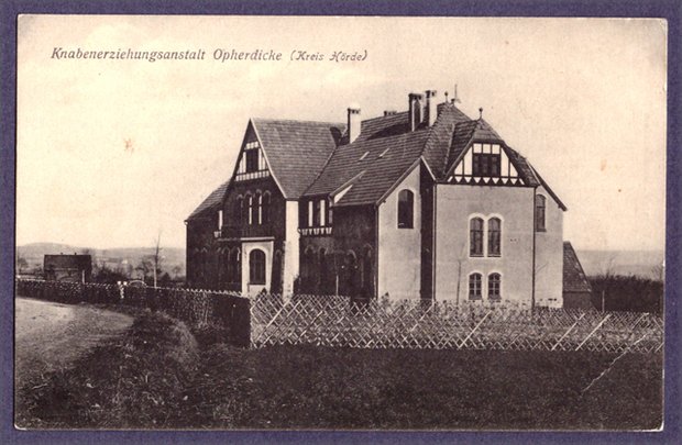 Folgend die „Knaben“erziehungsanstalt Opherdicke (Kreis Hörde) auf einer Ansichtspostkarte aus dem Verlag Julius Flechtner (Unna, Holzwickede, Bad Königsborn).