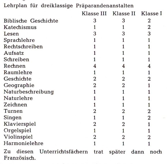 Die bautechnischen Gegebenheiten zur Präparandenanstalt wurden bereits vorgestellt, es gilt aber noch ein Blick auf die Ausbildungssituation der Zöglinge zu werfen. Begabte Volksschüler mit dem Wunsch zur Lehrerausbildung konnten in Holzwickede sich vorbereiten auf die Aufnahmeprüfungen in den evangelischen Schullehrer-Seminarien der Provinz Westfalen und dies war in diesem Fall in der Regel die Stadt Soest. Der Tagesablauf war vom Wecken um 6Uhr bis zur Bettruhe um 21.30Uhr streng reglementiert mit den Zeiten zu den Mahlzeiten und beinhaltete zudem an Schul- und Arbeitszeiten insgesamt täglich 9 1/2 Stunden! Von den ersten 11 Zöglingen mit Einweihung vom 1. Februar 1872 haben sich dann auch 9 zur Aufnahmeprüfung angemeldet und wohl überdurchschnittlich alle bestanden und dies war sicherlich ein großer Erfolg für den ersten Lehrer und Inspektor Friedrich Nase. Der Andrang auf Aufnahme in die Präparande war groß, bald waren bis zu 100 Zöglinge 3klassig zu unterrichten und dazu einmal der Lehrplan aus Schrift von K. Ligges aus dem Jahr 1969.