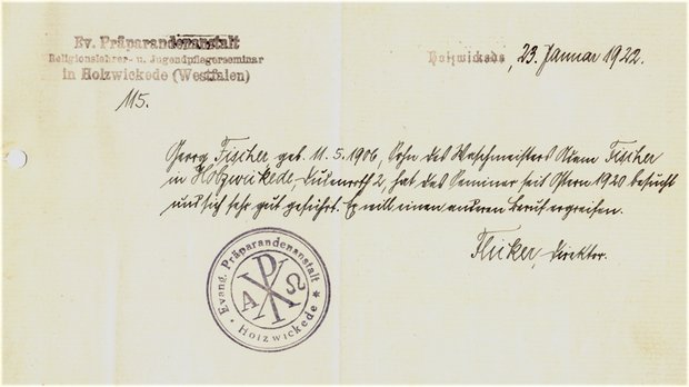Im obigen Schreiben vom 23. Januar 1922 bestätigt Direktor Flicker die gute Führung des Präparanden Georg Fischer aus Holzwickede seit dem Jahr 1920, der die Anstalt verlässt, um einen anderen Beruf zu wählen. Vielleicht war diese Entscheidung mit der bevorstehenden Verlegung nach Barmen verbunden.
