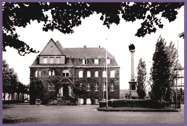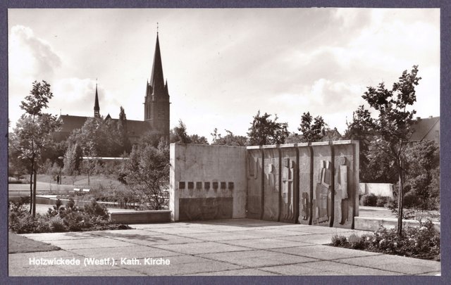 Ab dem Jahr 1962 wurde der Rathausplatz umgestaltet, das Denkmal entsorgt und eine neue Gedächtnisstätte im neu gestalteten Emscherpark aufgestellt, die vom Bildhauer Josef Baron aus Unna-Hemmerde geschaffen wurde. Rechts noch im Hintergrund das Stahlgerüst der Feuerwehr zur Schlauchtrocknung auf dem Marktplatz (später hier Gebäude Wasserversorgung, heute hier Rathausneubau).