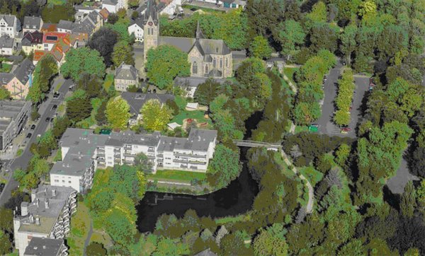 Zur Vollständigkeit noch der erste Teich als Regenrückhaltebecken zwischen Opherdicker- und Kirchstraße westlich vom heutigen Parkplatzgelände im ehemaligen Gräftenbereich südlich der katholischen Kirche und durch die Emschergenossenschaft neu gestaltet (danke Copyright Hans Blossey).