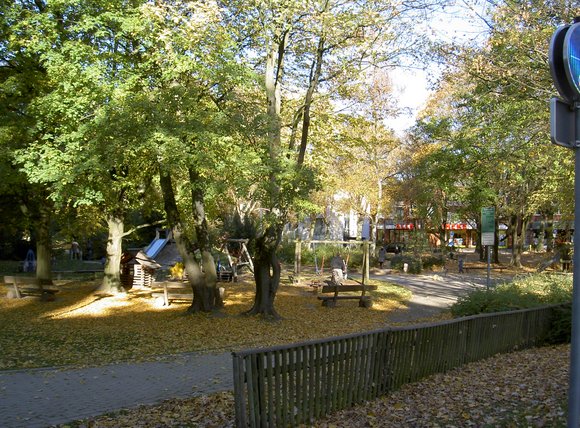 und noch ein Blick auf den Kinderspielplatz in älterer Version, mittlerweile aber von Bäumen umringt und Blick in Richtung Ärztehaus mit der Allee - Apotheke.