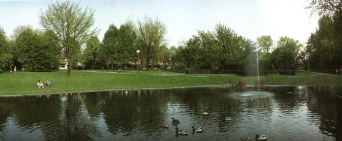 Dazu ein Blick auf dieses Gelände in Richtung Ärztehaus Allee 15 und damals noch mit einer Zweigstelle der Sparkasse (heute Reinke, Optiker) besetzt. Erkennbar ist der Emscherteich mit seinen Entenbewohnern und seiner Wasserfontäne. Dies war der Anblick vor der letzten Umgestaltung durch die Emschergenossenschaft ab dem Jahr 2009/10.