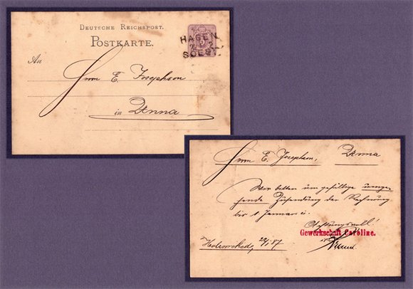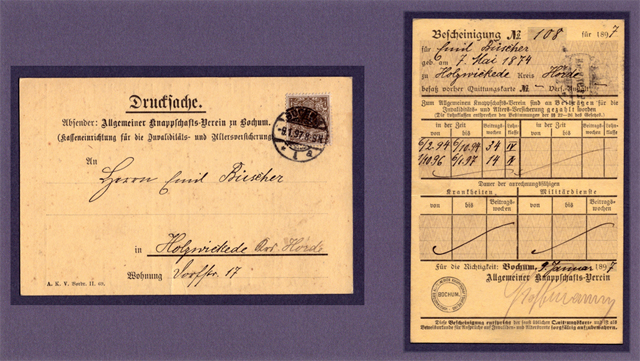 Dazu ferner eine Postkarte mit Vor- und Rückseite des Allgemeinen Knappschafts-Vereins zu Bochum an den versicherten Emil Büscher in Holzwickede mit Datum vom 9.1.1897