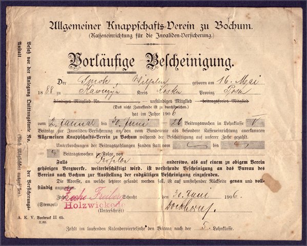 Dazu ferner eine Vorläufige Bescheinigung vom Allgemeinen Knappschaftsverein zu Bochum für Einzahlungen in der 5.Lohnklasse. Der Bergmann arbeitete auf der Zeche Freiberg im östlichen Randgebiet von Sölde (ab 1927/29 zugehörig zu Holzwickede). Datum 30.Juni 1906. Die Zeche Freiberg wurde im Jahr 1912 wegen Erschöpfung der Kohlenflöze stillgelegt und war nebenbei bemerkt jahrelang in der Jahresproduktion der Zeche Caroline voraus. Interessant zum roten Stempel Zeche Freiberg der weitere Stempel Holzwickede ebenfalls im Rotton. Vielleicht hatte der Knappschaftsverein in Bochum schon die Gebietsreform geahnt.