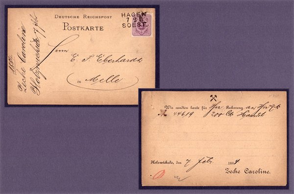 Zurück zur Zeche Caroline zum Ende des 19. Jahrhunderts. Folgend erneut eine Postkartenbeförderung auf der Bahnpoststrecke Hagen – Soest aus dem Jahr 1887 und hier mit dem Gumminebenstempel im Farbton rot nun der Gewerkschaft Caroline. Gebeten wird um die Zuführung einer Rechnung.