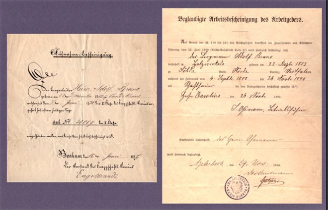 Der Bergarbeiter Heinrich Adolf Brune geb. am 23. Dezember 1852 zu Landskrone (im Dreick Sölde, Sölderholz und Holzwickede) war Bergmann II. Klasse in der Aufnahme = Bescheinigung der Knappschaft – Bochum am 16. Juni 1876 und erhielt die Nummer 36069) (Erstregistrierung unter 24846 am 7.12.1871) und dazu findet sich noch eine beglaubigte (im Amt Aplerbeck im Kreis Hörde) Arbeitsbescheinigung des Arbeitgebers mit der Zeche Caroline mit Datum vom 26. November 1890.