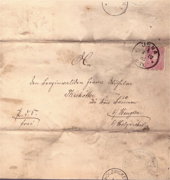Aus dem Jahr 1885 kann ich einen Brief vom Amtsgericht Unna mit Datum vom 28.11. (Einkreispoststempel Unna und Holzwickede) vorstellen mit der Anschrift