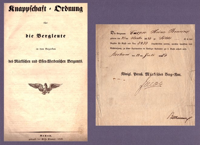 Dazu einmal beispielhaft die Bergarbeiter-Familie Brune aus Landskrone – Sölde. Mit Eintritt in die Knappschaft erhielt der Bergmann die Knappschaftsordnung ausgehändigt, hier in der Auflage aus dem Jahr 1845.