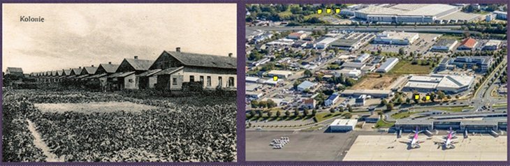Links die Zechenarbeiterkolonie aus dem Jahr 1873 und das Gelände gehört zum Gewerbegebiet Wilhelstraße/Zur Alten Kolonie und ist mit einem gelben Rechteck auf der rechten Ansicht versehen. Angesiedelt wurden auf dem Gelände der Kolonie u.a. Firmen aus dem Baustoffsektor, Autohäuser, Getränkemarkt und eine Tankstelle. Die beiden gelben Rechtecke unmittelbar vor dem neuen Porsche-Zentrum gehören noch zum Gewerbegebiet ECO Port, der nach Westen hin stark verbreitert ist und dort sein Hauptgebiet umfaßt s. später mehr dazu. Die drei gelben Rechtecke betreffen das Gewerbegebiet zwischen Natorper- und Stehfenstraße und davon ist die Fa. Sonepar sichtbar. Deutlich erkennbar ferner die unmittelbare Nähe von Holzwickede zum Flughafen Dortmund (Copyright H. Blossay).