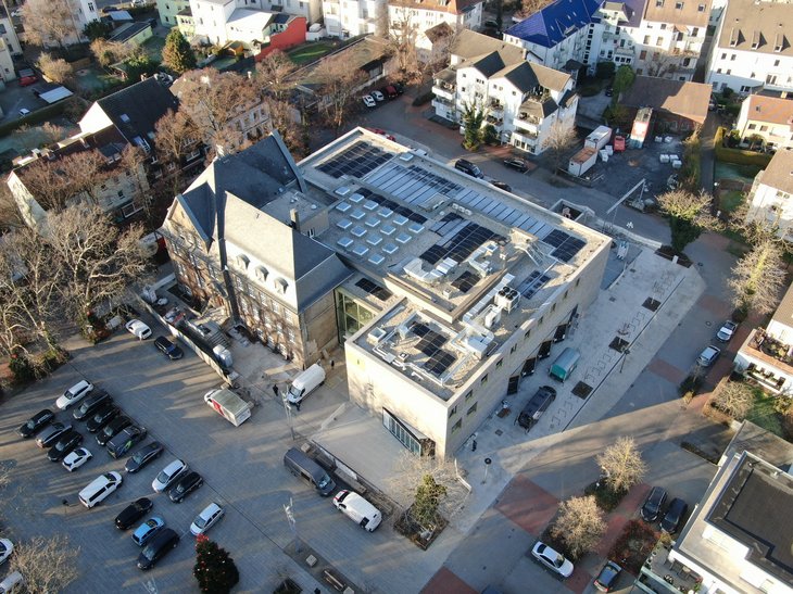 Mit einer Luftbildaufnahme von Detlef Drossel möchte ich den Rathausanbau in seiner Vorstellung abschließen. Gut sichtbar die Lichtkuppeln zum Foyer, die Photovoltaikplatten und die Wärmepumpen auf dem Dachgeschoss.