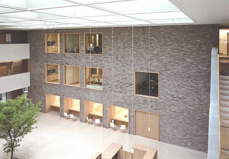 Blick in das Foyer (Foto Gemeinde T. Gernreich). Angeschnitten der Informationsbereich, die 4 Beratungsplätze an der Nordseite und links noch der amerikanische Olivenbaum vor dem integriertem Altbau. Der Olivenbaum benötigt achtsame Betreuung mit Speziallichtstrahlern und Bewässerung, ist aber unbestritten ein Highlight im Foyer des Rathauses.